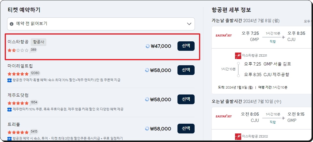 마지막으로 저가항공권 예매를 진행할 업체를 선택해야 하는데요. 업체에서 제시한 금액과 평점, 혜택을 참고하여 선택하면 됩니다.