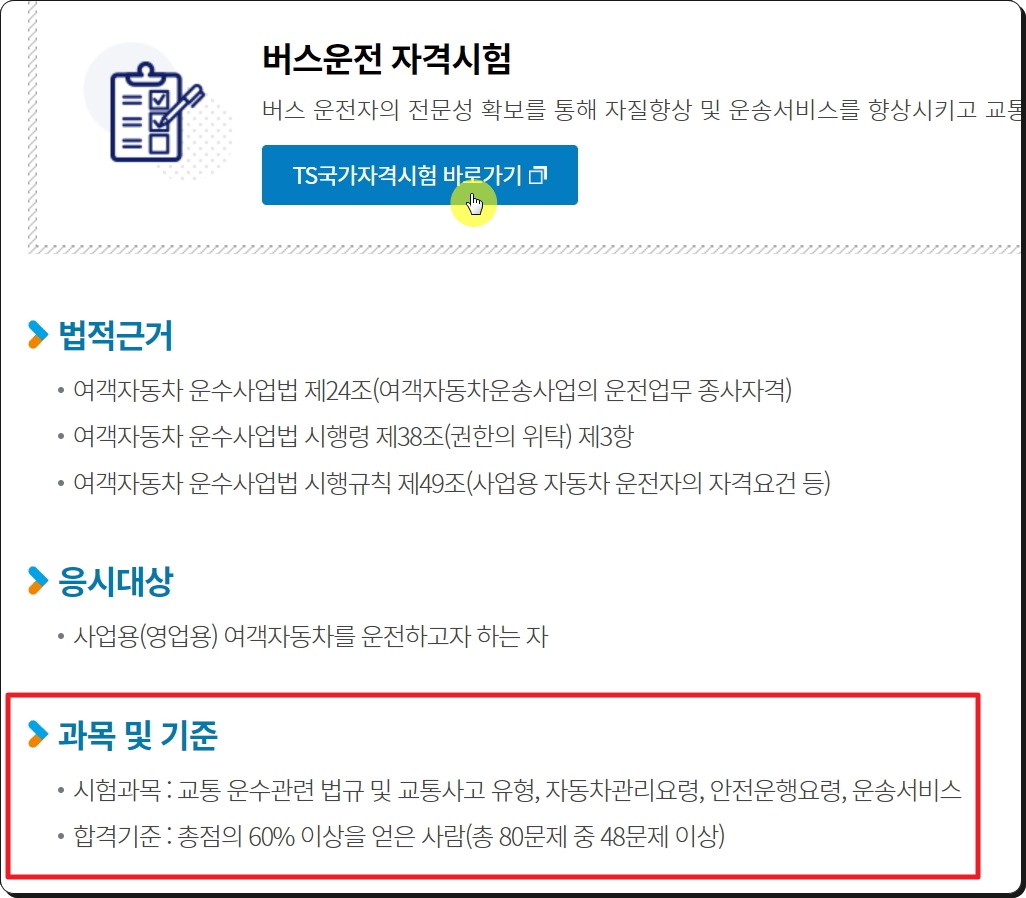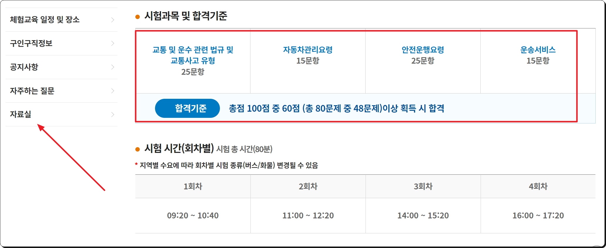 - 시험과목 : 교통 운수관련 법규 및 교통사고 유형(25문항), 안전운행요령(25문항), 운송서비스(15문항), 자동차관리요령(15문항)