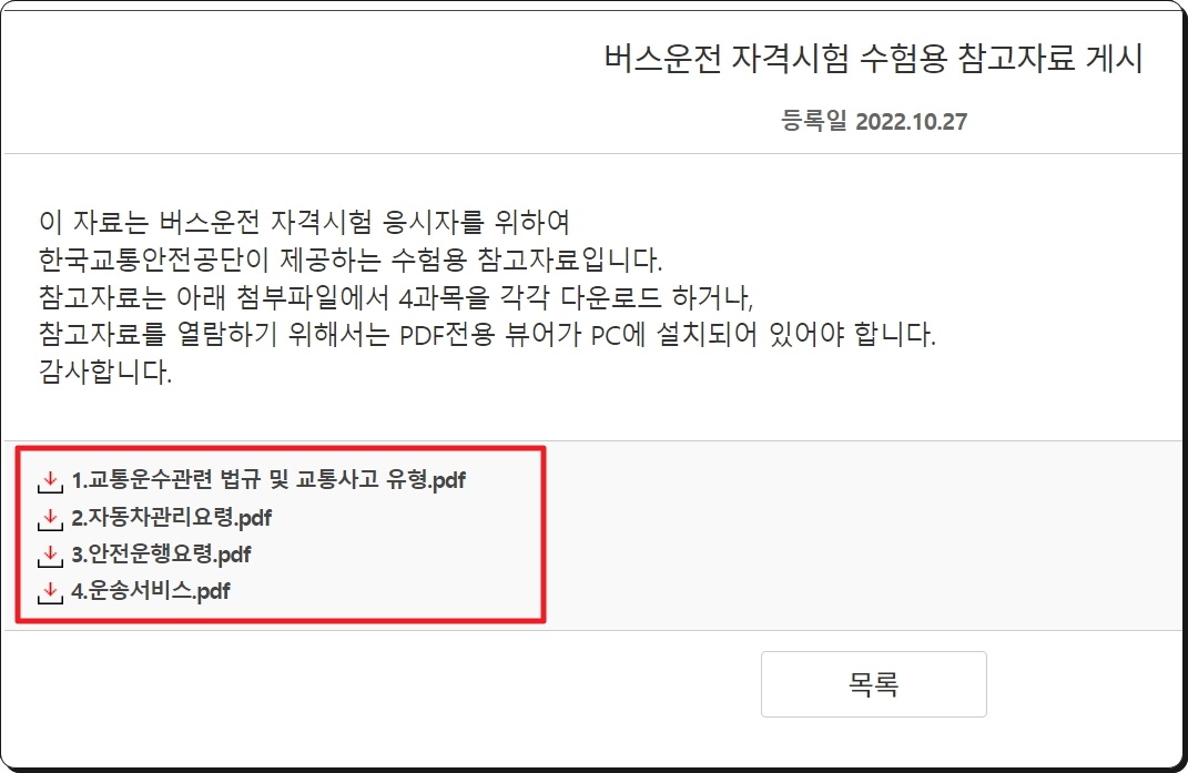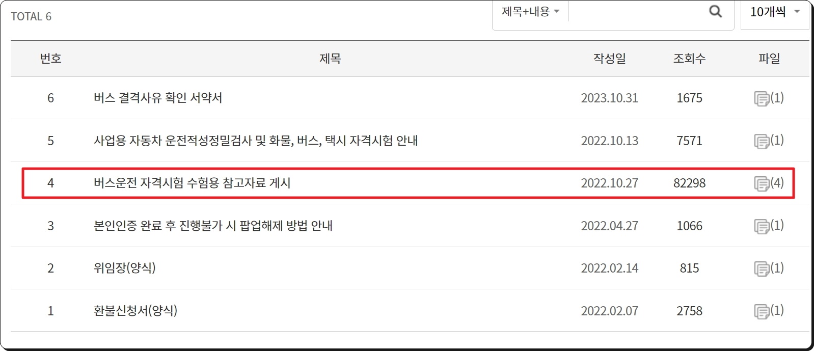 자료실에서는 4번째 게시물인 "버스운전 자격증 시험 수험용 참고자료 게시"를 선택해 주세요. 8만 명 이상이나 조회를 했을 정도로 기출문제집과 함께 많은 사람들이 찾는 자료입니다.