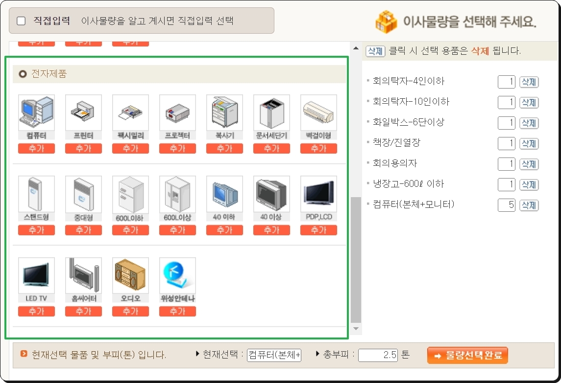 이삿짐 물량도 정확하게 입력하면 견적을 받아보는 데에 매우 용이한데요. 사무실 안에서 옮겨질 물량을 알고 있다면 선택입력 버튼을 누르고, 그렇지 않은 경우에는 직접입력 버튼을 눌러주세요. 직접입력 페이지가 열리면 이삿짐 선택을 할 수 있는 페이지가 나타나는데요. 컴퓨터, 프린터, 팩시밀리, 복사기, 에어컨 등 여러 가지를 선택할 수 있게 되어 있습니다. 사무실 안에서 다른 곳으로 옮겨질 대상이 되는 물품을 모두 선택해 주세요.