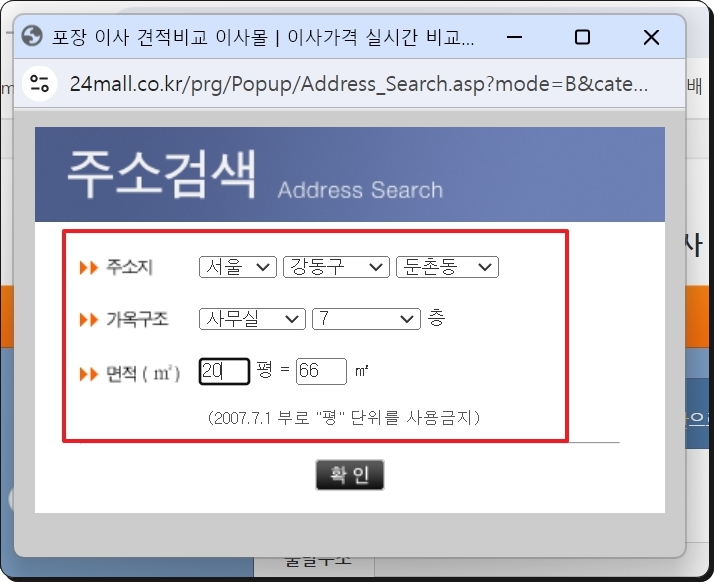 먼저 주소를 입력하는 방법입니다. 주소 검색 버튼을 누르면 상세 주소를 입력할 수 있는 창이 열리는데요. 여기에서 주의하실 점은 가옥구조 부분에서 층수를 선택해야 되는 것입니다. 사다리차가 필요한지 여부를 알려줘야 하기 때문이에요. 그리고 면적도 알고 있어야 정확한 견적을 내기에 용이하죠. 날짜의 경우에는 버튼 클릭만 하면 될 정도로 쉽게 선택할 수 있게 되어 있습니다.
