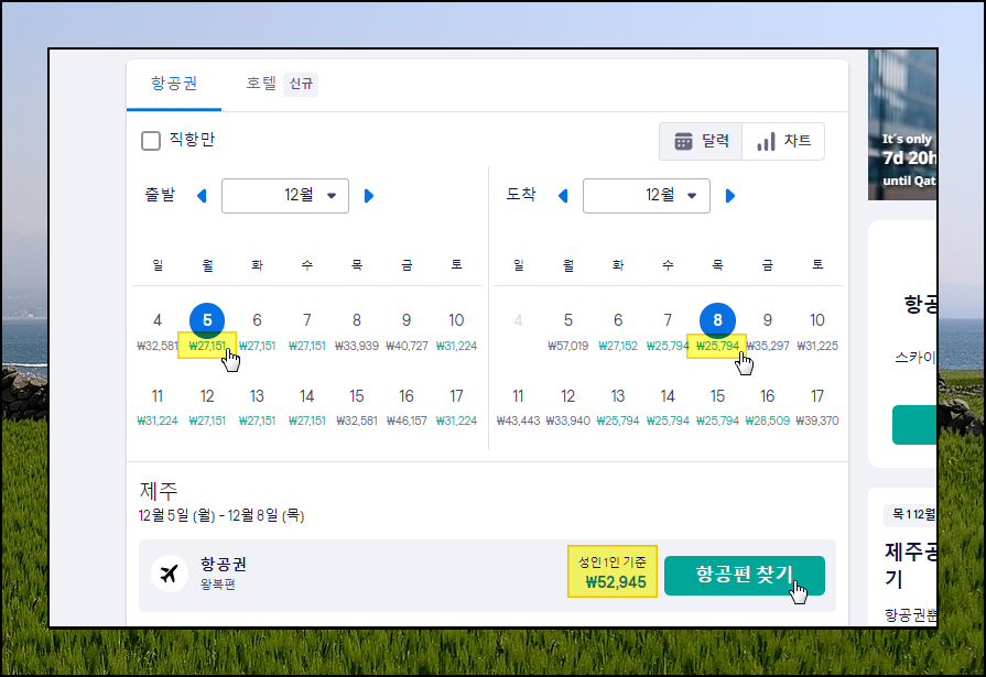 항목 입력 후 [항공권 검색] 버튼을 클릭했습니다. 이에 따라 날짜별 최저가 금액을 확인할 수 있는 페이지가 열리는데요. 여기에서 본인의 제주 여행 스케쥴을 감안하여 저렴한 가격이 표시된 날짜를 클릭해 주세요. 저는 12월 5일에 출발해서 8일에 돌아오는 날짜를 선택했는데요. 이에 따라 최저가 항공권을 52,945원에 구매할 수 있다고 합니다. 여기에 나타난 항공권 금액은 말 그대로 최저가를 의미합니다. 여러 가지 조건을 덧붙이면 비행기표 사는 금액이 조금 올라가는데요. 그래도 다른 날짜를 선택하는 것보다 상대적으로 저렴하기 때문에 날짜 선택이 중요합니다.