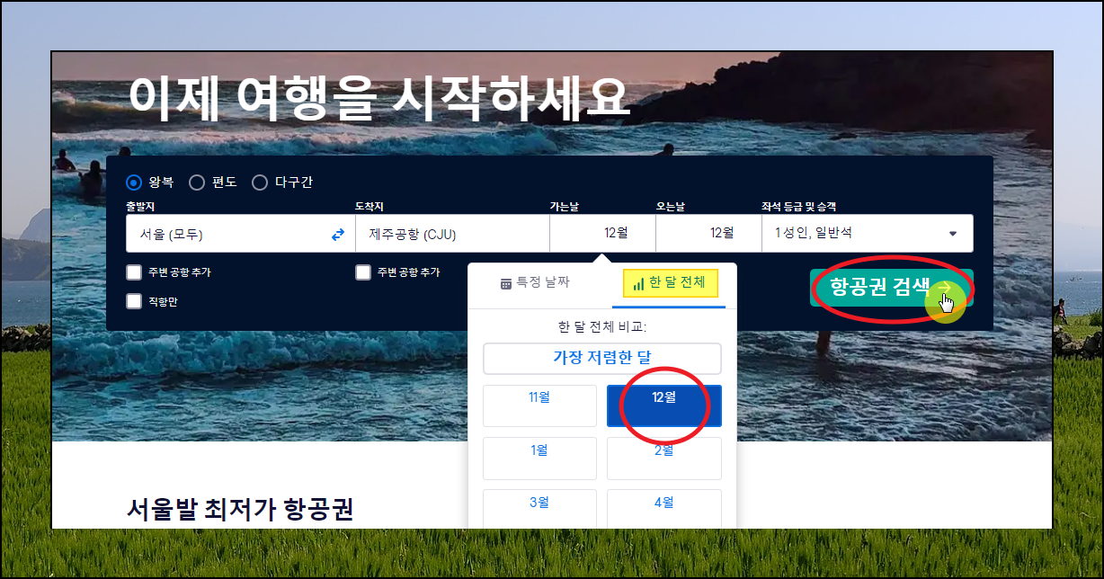 스카이스캐너 사이트에 접속했습니다. 가장 먼저 해야 할 일은 제주 비행기표 정보를 입력하는 것입니다. 간단하게 화면에 나와 있는 항목을 채워 넣기만 하면 되는데요. 여기에서 날짜를 입력하는 부분은 "한 달 전체" 단위로 지정하는 것이 좋습니다. 이렇게 하면 해당 월에 가장 싸게 판매되는 제주 항공권을 구할 수 있습니다.