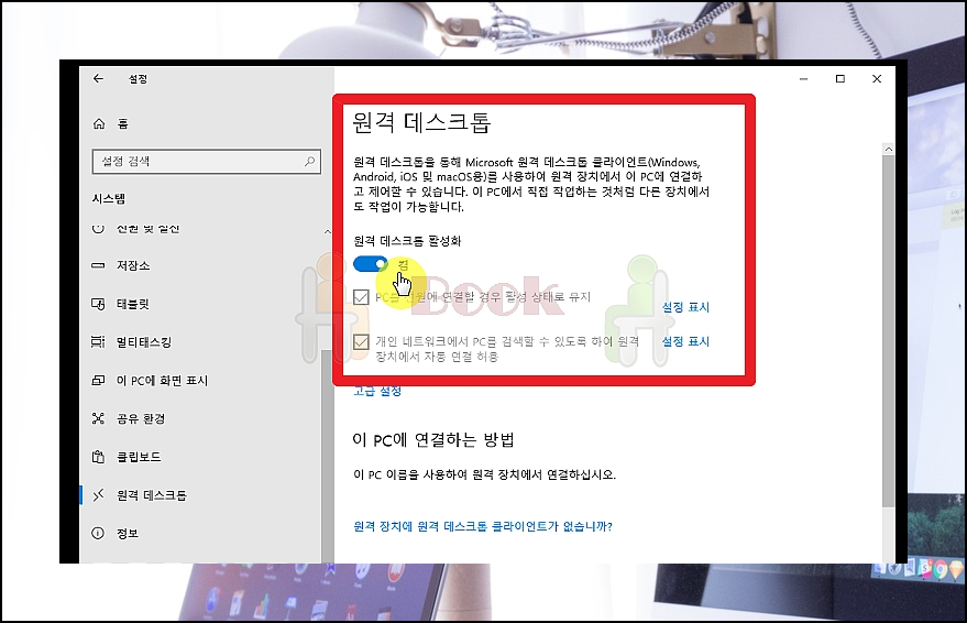 "원격 데스크톱" 페이지가 열리면 활성화 설정을 해주세요. 이 설정을 해주어야 다른 기기에서 해당 기기로 원격제어 접근이 가능하게 됩니다.