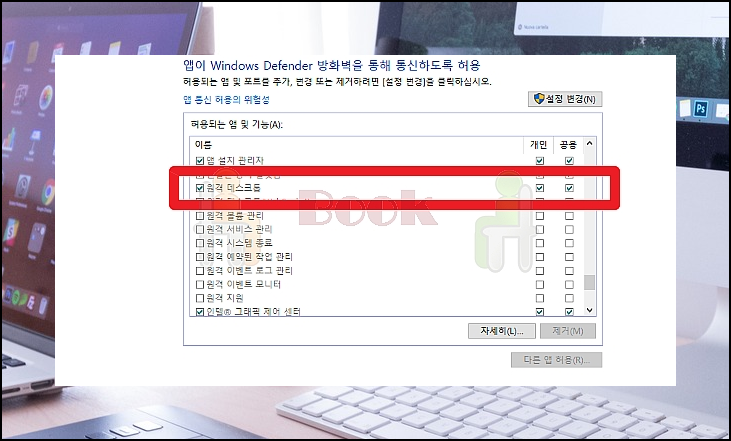 여러 가지 앱 리스트가 나타나는데요. 여기에서 "원격 데스트톱"을 선택한 후, 해당 앱에 대한 허용을 설정해주면 됩니다. 여기까지 한 후 처음 단계에서 등록한 PCs 값을 클릭해 주면 돼요. 그럼 먼 거리에 있는 기기를 지금 다루고 있는 컴퓨터처럼 다룰 수 있어요.