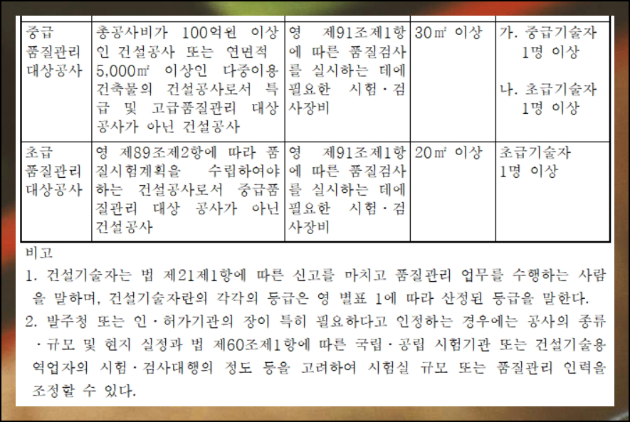 규모의 차이에 따라 현장 관리 시스템이 세분화됩니다. 특히 고급공사의 경우 품질관리계획 수립이 필수적인데요. 이러한 기준은 시행령에서 명확하게 제시하고 있어요. 장비와 시험실 규모도 공사 등급에 맞춰 차등 적용되니 참고하시기 바랍니다. 품질관리자의 배치는 공사 규모와 특성을 고려하여 결정되는데, 이는 현장의 안전과 직결됩니다.