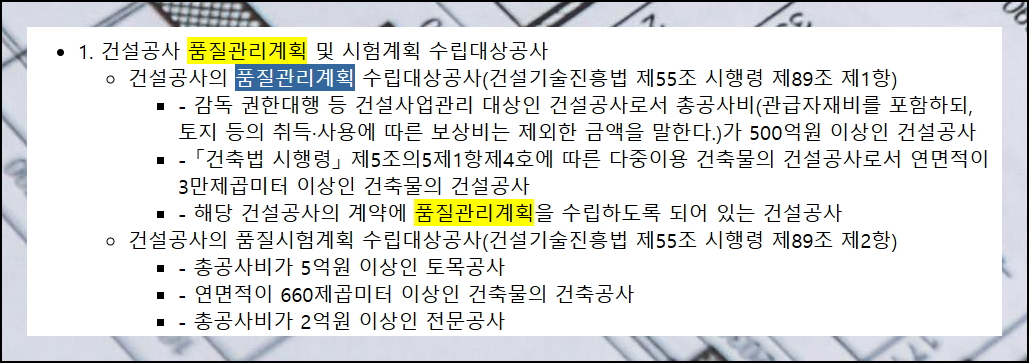 건설공사의 품질관리계획 수립 조건이 구체적으로 명시되어 있습니다. 공사금액이 500억원을 넘거나 건축물 연면적이 3만제곱미터 이상이면 특별한 관리가 필요해요. 계약상 품질관리계획 수립이 요구되지만 특급 공사가 아닌 경우는 고급공사로 분류됩니다. 이때 품질관리자의 배치 기준은 더욱 엄격하게 적용되며, 현장 상황에 따라 추가 인력이 필요할 수 있어요.