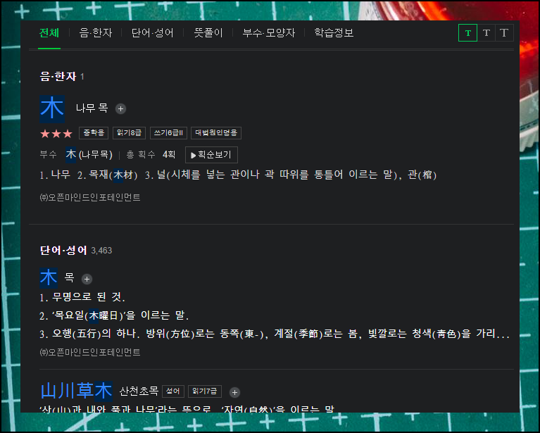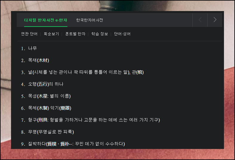 한자찾기가 완료되면 우리가 찾으려고 했던 문자는 물론이고, 관련 단어나 고사성어까지 풍부한 결과가 나타납니다. 결과 리스트에서 더 자세한 내용을 살펴보고 싶다면 알아보길 원하는 문자를 한 번 더 클릭해보세요.