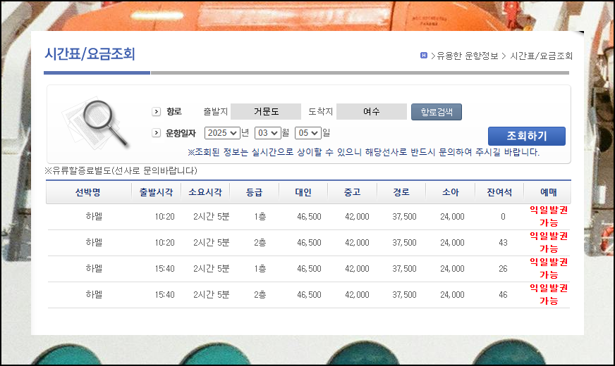 운항날짜를 지정하고 조회하기를 누르면 일정, 요금, 소요시간, 잔여석 등 여수 여객선터미널로 도착하는 모든 배 상세 정보가 표시됩니다. 거문도에서 출발하는 여객선의 경우에는 "하멜"이 운행 중이네요.