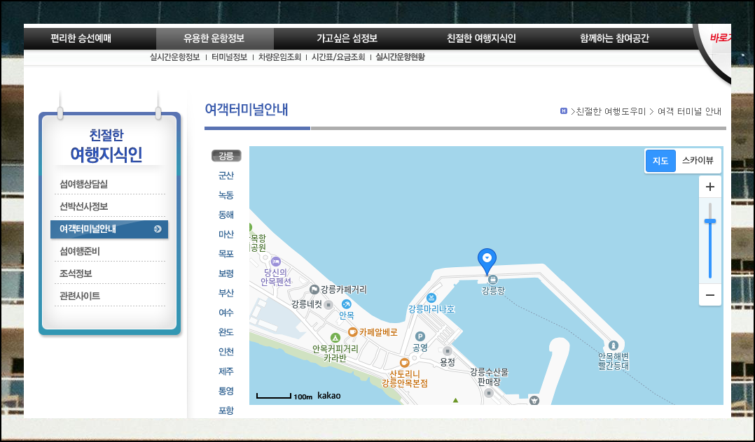 여수 여객선터미널은 교동 우체국 앞 사거리에서 남쪽으로 조금만 이동하면 위치해 있습니다. 운항 일정과 요금을 자세히 알아보려면 메뉴의 '터미널정보'를 클릭하세요. 주변 편의시설 안내도 함께 살펴보면 더욱 편리한 여행이 됩니다.