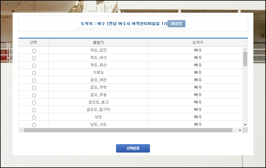 여수항으로 도착하는 배편을 찾으려면 도착지를 '여수'로 지정하세요. 여러 지역에서 이곳으로 향하는 여객선 데이터가 나타납니다. 설정을 마치셨다면 완료 버튼을 눌러 조회를 계속 진행합니다.