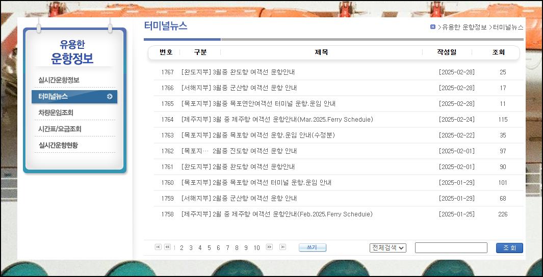 배 운항은 날씨나 계절에 따라 변동될 수 있으니 [터미널 뉴스] 메뉴를 클릭해보세요. 그럼 게시판이 하나 나타나는데요. 여기에서 여수 지역을 검색해 최근 변경사항을 확인해 보는 것이 좋습니다. 모든 안내를 살펴본 후 '시간표/요금조회' 버튼을 눌러 다음 단계로 넘어가세요.