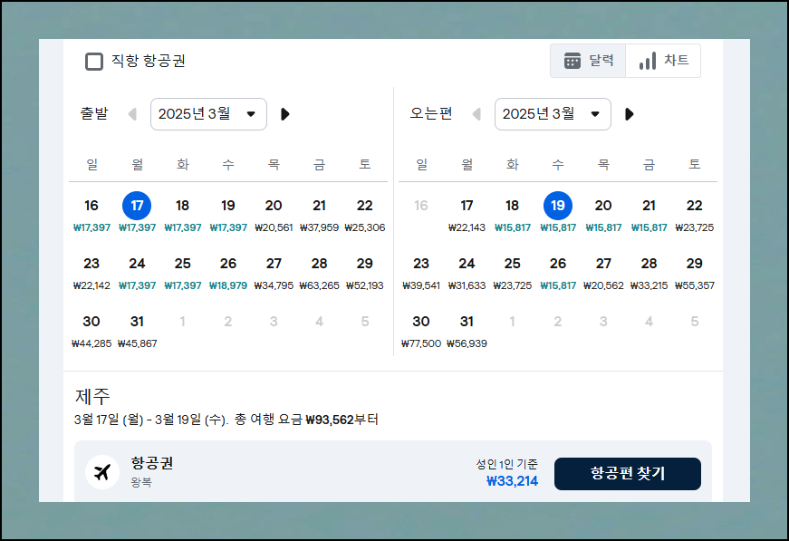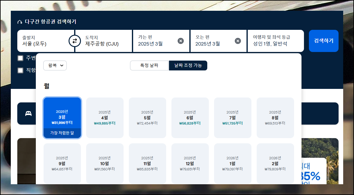 스카이스캐너에 접속하면 검색창이 표시됩니다. 목적지를 제주공항으로 설정하고, 여행 일정을 선택해야 합니다. 여기서 중요한 점은 특정 날짜보다는 한 달 전체로 설정하는 것이 유리해요. 예를 들어 '2025년 3월' 또는 '가장 저렴한 달'처럼 넓은 기간으로 조회하면 더 많은 요금 옵션을 비교할 수 있습니다.