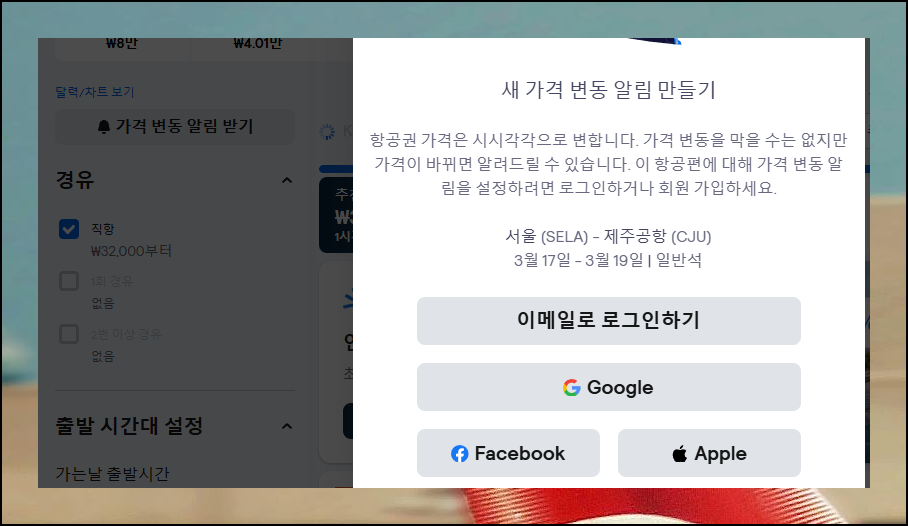 현재 제시된 금액이 아직 마음에 들지 않는다면 "요금 변동 알림 받기" 기능을 활용해보세요. 좌측 상단에 있는 이 버튼을 누르고 설정을 마치면 비용이 더 내려갔을 때 알림을 받을 수 있어요. 항공권 가격은 수시로 변동되므로 이 기능을 사용하면 최적의 조건을 놓치지 않을 수 있습니다.