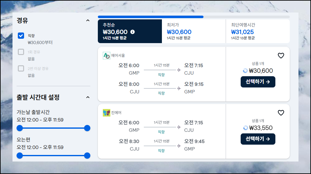 국내 노선은 거리가 짧으므로 [직항] 옵션을 우선적으로 고려하는 것이 좋습니다. 원하는 항공권을 발견했다면 [선택] 버튼을 눌러 예약을 진행하세요.