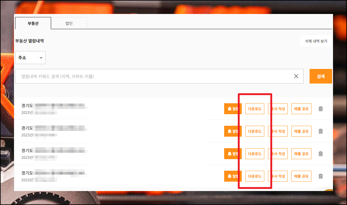 이전에 본 등기 서류를 재확인하려면 '부동산 열람내역' 메뉴를 선택하세요. 과거 조회 주소가 정리되어 있습니다. 원하는 장소의 다운로드 버튼으로 접근 가능해요.