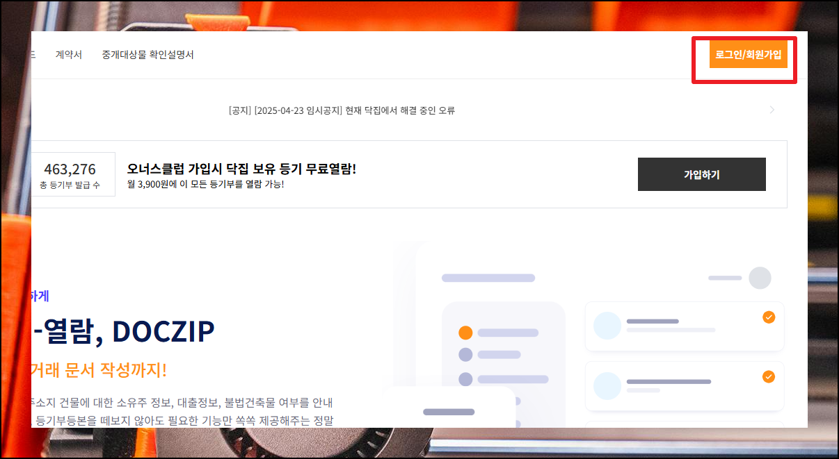 등기부등본 서류 확인을 위해 계정접속은 필수입니다. 부동산 관련 업무를 자주 보신다면 '오너스클럽' 멤버십이 유용할 거예요.