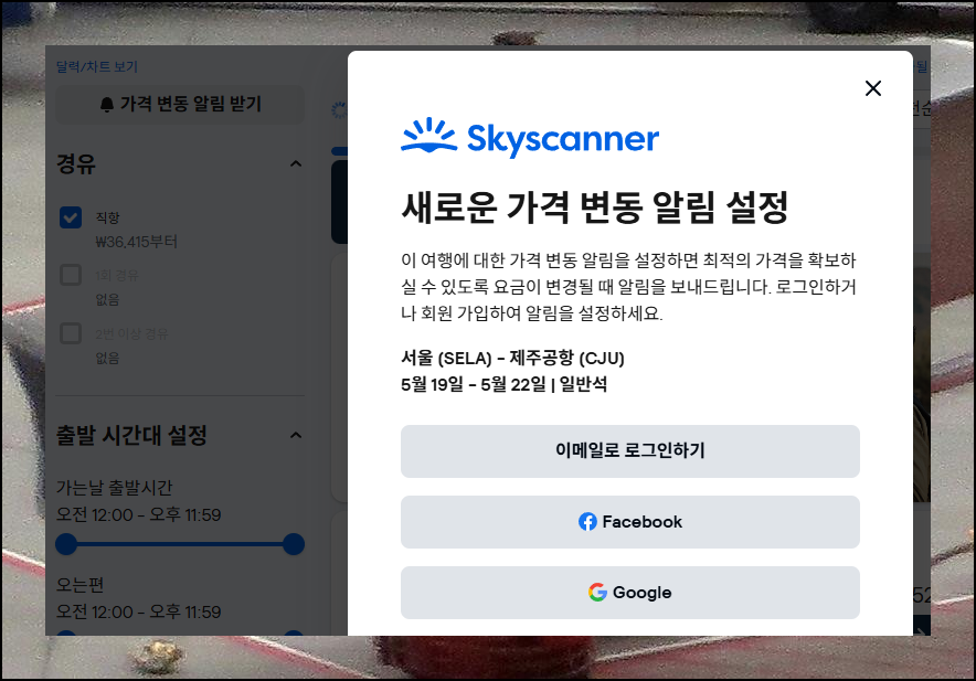 스카이스캐너의 '가격 변동 알림 받기' 기능을 활용해보세요. 알림 설정을 하면 현재보다 더 저렴한 티켓이 나타났을 때 바로 연락 받을 수 있습니다. 그때 예약을 바로 하면 좀 더 저렴하게 예매를 진행할 수 있어요.
