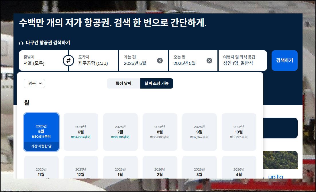 비행기표를 검색할 때는 출발지, 좌석 등급, 탑승객 수를 입력하세요. 가장 중요한 점은 날짜 선택인데요, '날짜 조정 가능'을 선택한 후 그 중에서도 '가장 저렴한 달'을 선택하면 최저가 제주도 항공권을 쉽게 찾을 수 있습니다.