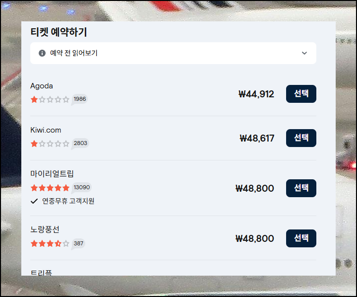 여러 여행사의 비행기표 가격 비교가 가능한데요. 해당 리스트에서 보면 업체마다 요금이 살짝 다릅니다. 추가 혜택을 제공하는 곳도 있고요. 직접 비교해보고 마음에 드는 곳을 선택하면 됩니다.