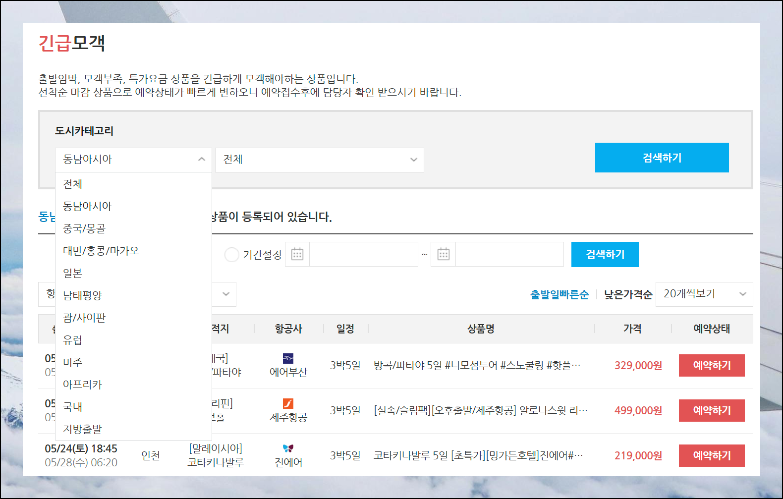 사이트에 방문한 후, 조금만 아래로 스크롤하면 해외여행 긴급모객 리스트를 쉽게 찾을 수 있습니다. 그 아래에는 땡처리 항공권 정보도 함께 표시되어 있어요.