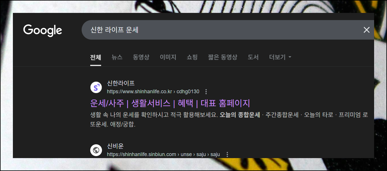 바로 신한라이프 사이트에서 제공하는 역술 서비스인데요. "신한 라이프 운세"라고 검색하면 바로 해당 서비스로 접속할 수 있습니다.