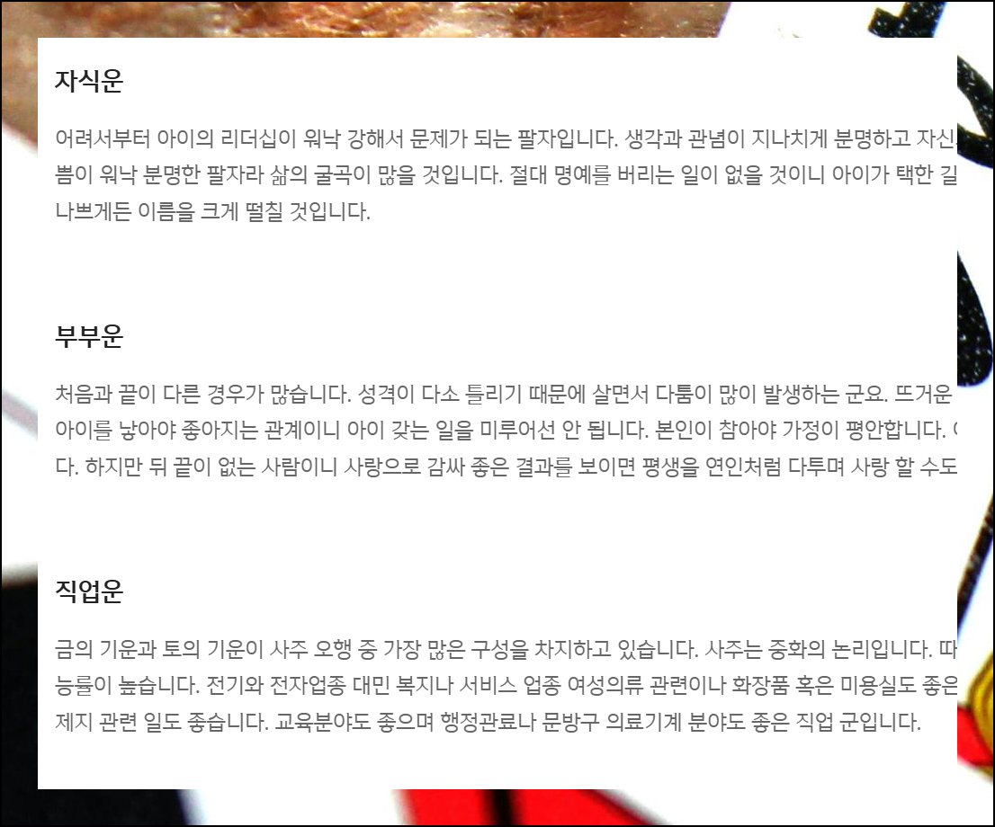이제 형제, 자식, 부부와 관련된 운세 정보가 등장해요. 가족은 소중한 만큼 나에게 큰 영향을 주는 존재입니다.