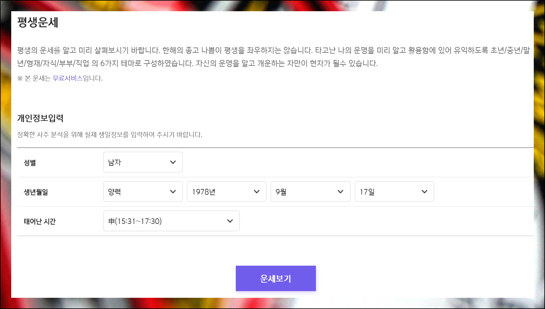 참고로 1년 단위로 나의 운세가 궁금하다면 토정비결을 이용하는 것이 좋고, 평생에 걸친 운명을 알고 싶을 때에는 "평생운세"를 이용하는 것이 좋습니다.