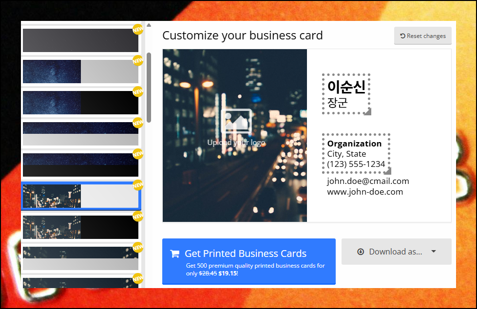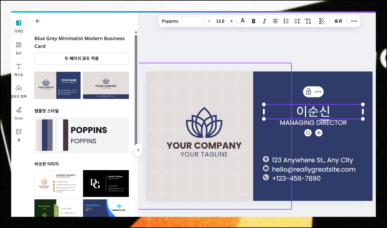 왼쪽에 나온 디자인 템플릿 중 하나를 골라보세요. 선택하자마자 오른쪽 미리보기 창에서 해당 디자인을 확인할 수 있어요. 이제 개인 로고를 넣거나 이름, 직책, 회사명, 웹주소, 메일 주소, 연락처 등을 입력하면 돼요.