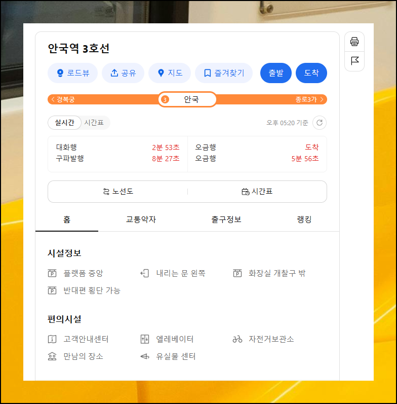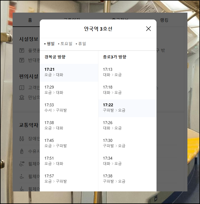 해당 서비스에서는 서울권 전철 운행시각표까지 제공되고 있어요. 안국역 기준으로 경복궁 쪽과 종로3가 쪽 열차가 언제 들어오는지 정확히 알 수 있어요. 평일과 주말로 세분화되어 있으니 날짜에 맞춰 확인하시면 되어요.