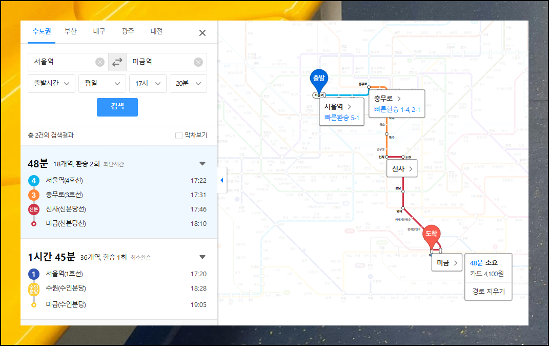 실제 사용방법을 익혀보겠습니다. 왼쪽 상단 검색 영역을 찾아보세요. 시작점으로 서울역을 기입하고, 목적지로 미금역을 입력해보았어요. 언제 출발할지 시간까지 정한 뒤 "검색" 버튼을 눌러주세요.