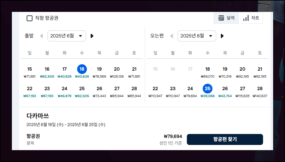 여행 일정을 고려해서 비행기표 가격이 저렴한 날짜를 선택하시면 되는데요. 제가 검색했을 당시에는 왕복요금이 7만 9,694원이 나오네요. 성수기와 비수기 간의 비용 격차가 상당하니까 미리 확인해보세요.