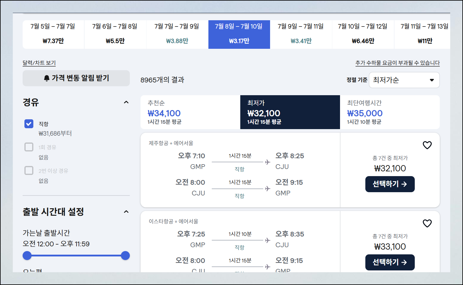 검색을 누르면 달력 형태의 요금 비교표가 화면에 나타나요. 예를 들어 2025년 7월에 해당하는 제주항공권을 검색해보니 여러 날짜 중에서 8일 출발하고, 10일 복귀하는 일정의 왕복 티켓이 가장 경제적이었습니다. 이런 방식으로 최적의 날짜를 파악한 후에 [항공편 찾기] 버튼을 클릭하면 됩니다.