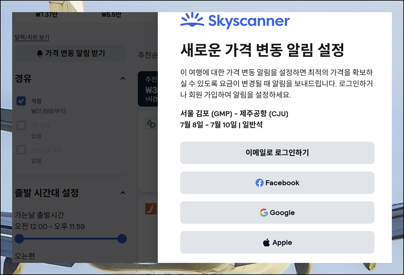 인터넷으로 제주항공권을 조회할 때마다 금액이 조금씩 달라지는 경우가 많아요. 항공료는 수요와 공급의 원리에 따라서 매시간 실시간으로 변동이 되기 때문이에요. 지금까지 안내해드린 방법을 그대로 따라했는데도 만족스러운 가격비교 결과를 찾지 못하셨다면 스카이스캐너의 [요금 변동 알림 받기] 서비스를 이용해보세요.