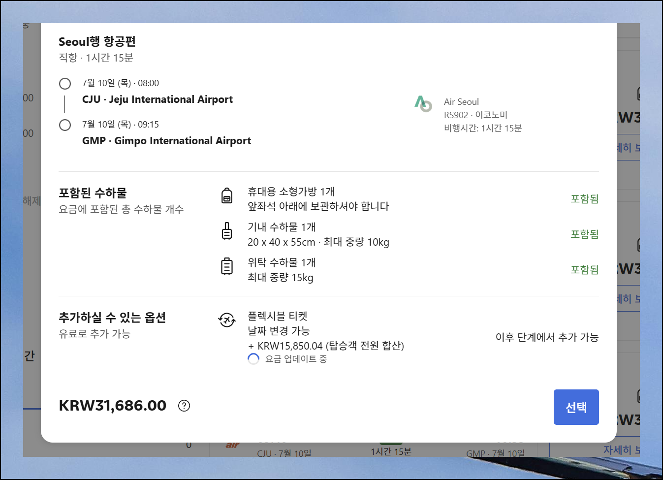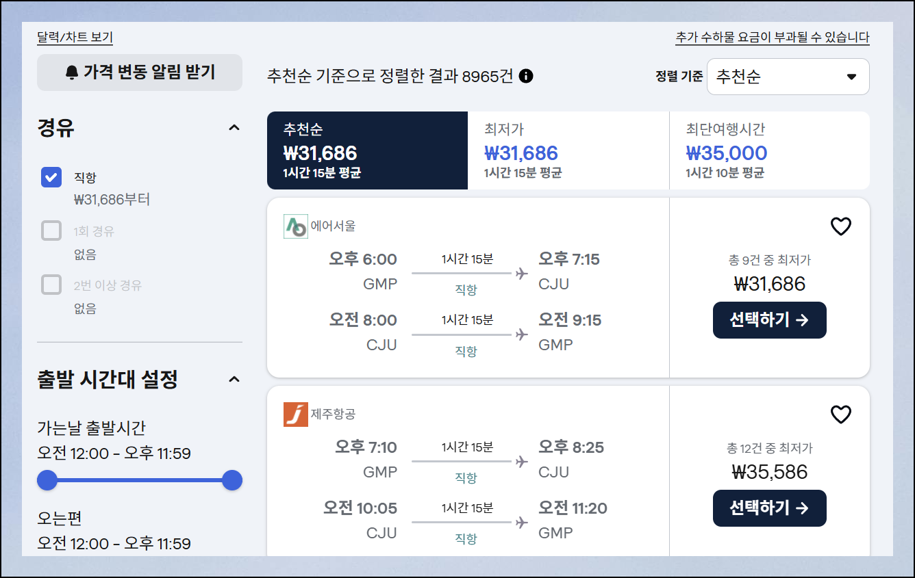 원하는 날짜가 정해지면 해당 일자에 운항하는 모든 제주행 비행기 리스트가 표시됩니다. 각각 다른 항공사와 출발 시간대를 보유하고 있어서 본인의 상황에 맞게 선택하면 되는데요. 화면 상단에는 추천순, 최단 소요시간순, 최저가순으로 항공편을 재정렬할 수 있는 옵션이 준비되어 있어요.