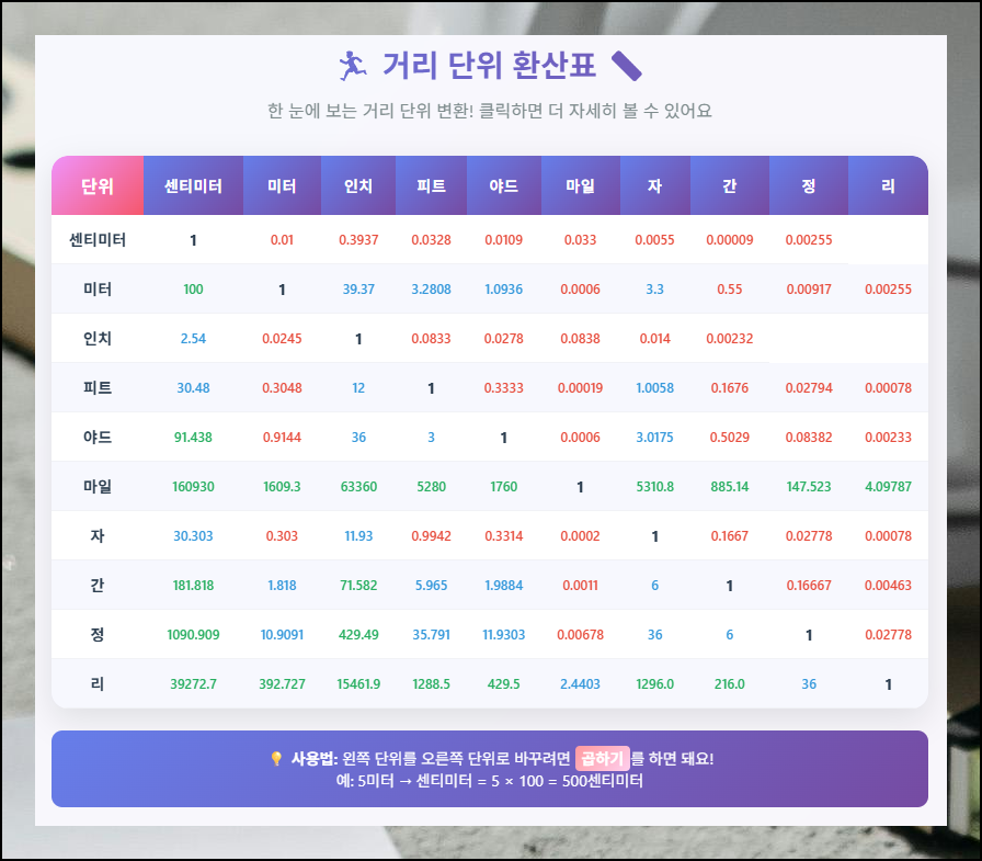 길이를 측정하는 다양한 기준들을 체계적으로 비교해보겠습니다. 우리가 일상에서 만나는 cm와 m부터 시작해서 인치, 피트, 야드, 마일 같은 영미권 기준까지 포함했어요. 전통적인 한국 기준인 자, 간, 정, 리도 빠뜨리지 않고 정리했습니다. 이렇게 총 10가지 거리 단위를 한 곳에 모아 놓으니 각각의 관계를 쉽게 파악할 수 있는데요. 서로 곱하는 방식으로 환산도 쉽게 할 수 있습니다.