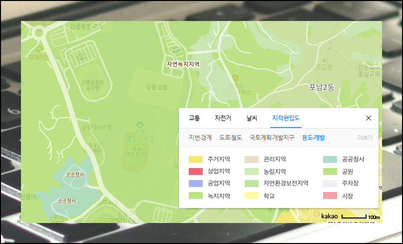 용도 및 개발 메뉴를 통해 더 세밀한 분류도 가능해요. 주거지역, 상업지역, 공업지역, 관리지역, 농림지역이 색으로 구분되어 있습니다. 학교, 공공청사, 공원, 주차장, 시장 등의 시설도 별도로 표시되니 참고하시면 좋아요.