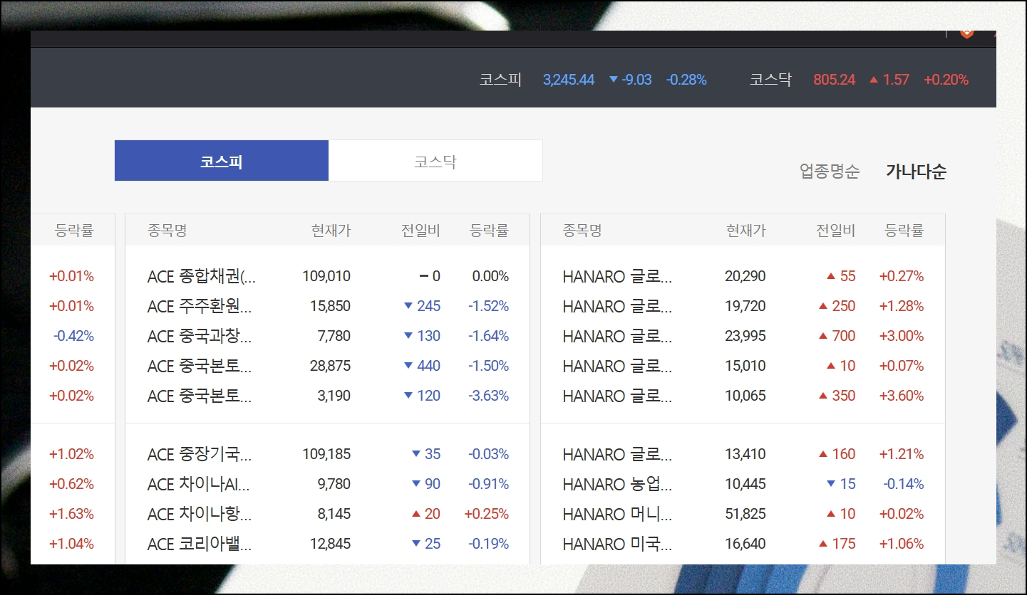 이제 우리가 원하던 실시간 주식 전종목 시세를 볼 수 있는 온라인 전광판이 나타났어요. 코스피는 물론이고, 코스닥 정보까지 모두 한눈에 확인할 수 있어요. 가나다순 정렬 기능을 사용해보면 업종별 분류가 아닌 가나다 순서로 전종목이 배열되는 걸 확인할 수 있어요. 특정 종목의 현재 시세를 빠르게 찾고 싶을 때 가나다순 정렬이 특히 유용해요.