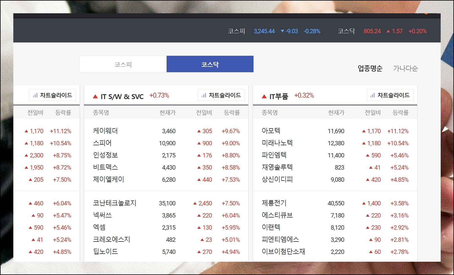 예전에는 주식 시세를 보려면 증권사 지점을 직접 방문해야 했어요. 그곳에 설치된 전광판을 통해서만, 주식 전종목 시세를 확인할 수 있었죠. 하지만 지금은 상황이 완전히 달라졌어요. 집에서 편안하게 앉아 컴퓨터만 켜면 모든 주식에 대한 실시간 시세 정보를 손쉽게 얻을 수 있습니다. 게다가 업종별로 분류해서 시장의 전체적인 흐름도 파악할 수 있어요.