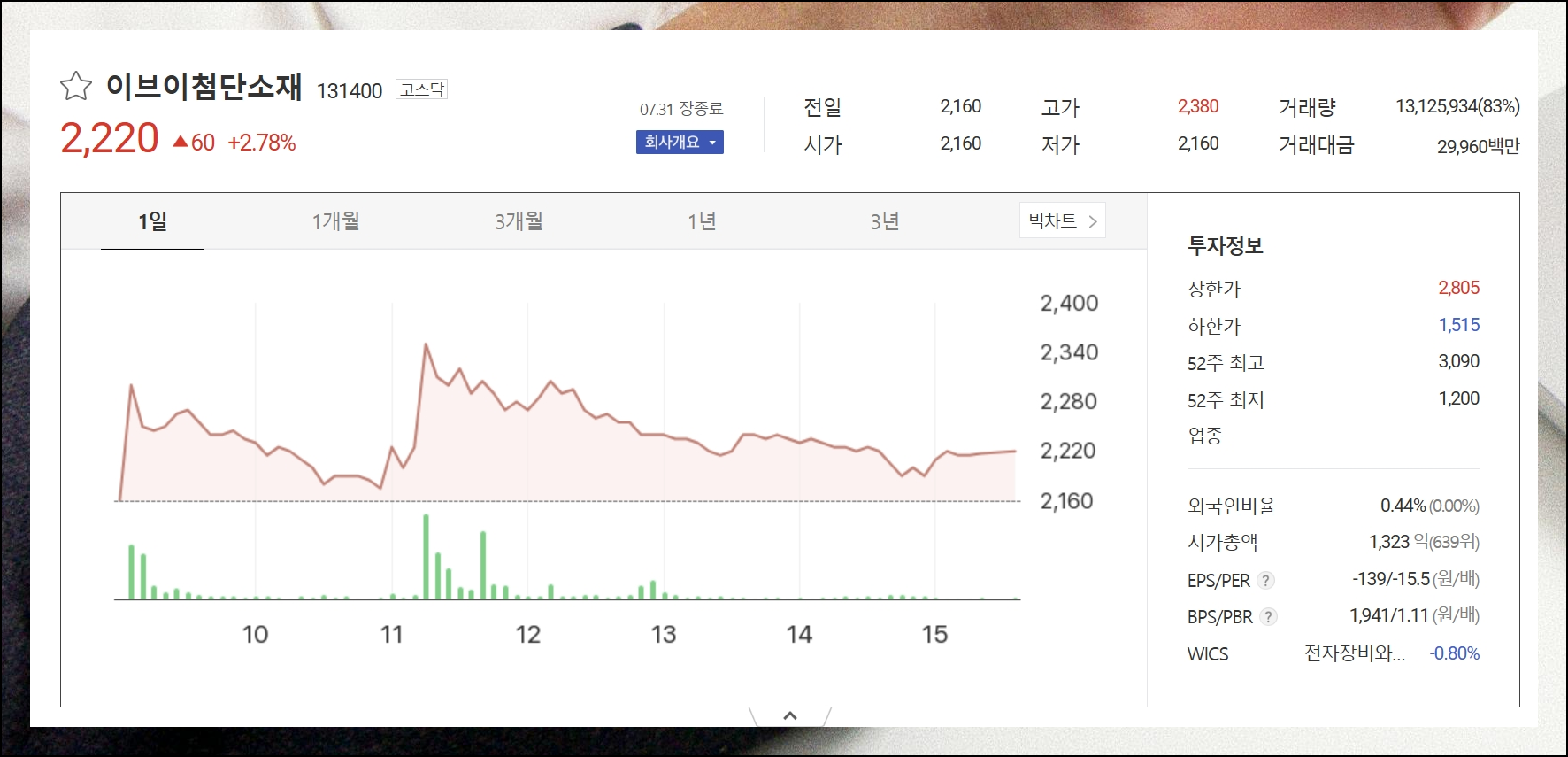예시로 "이브이첨단소재"라는 종목을 선택해봤어요. 실시간으로 움직이는 차트부터 시작해서 투자 판단에 필요한 모든 상세 정보들을 체크할 수 있어요.