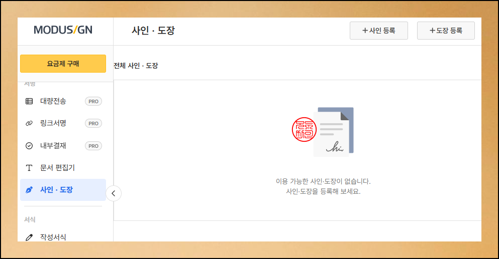 로그인을 완료하면 모두싸인 전용 관리 페이지가 화면에 나타나게 됩니다. 왼쪽 사이드바를 보시면 다양한 메뉴 옵션들이 정리되어 있어요. 이 중에서 사인과 도장 메뉴를 클릭해주세요. 메인 페이지 우측 상단에 있는 만들기 버튼을 찾아서 눌러주시면 다음 단계로 넘어갈 수 있어요.
