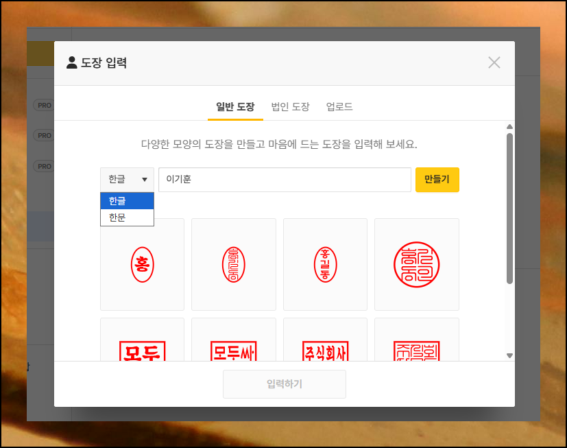 이 플랫폼에서는 두 가지 타입의 인감을 제작할 수 있어요. 개인이 사용하는 일반용과 회사에서 쓰는 법인용이 있습니다. 스탬프에 새겨넣고 싶은 텍스트를 한글이나 한문으로 입력창에 적어주시면 됩니다. 입력이 끝나면 만들기 버튼을 클릭해보세요.