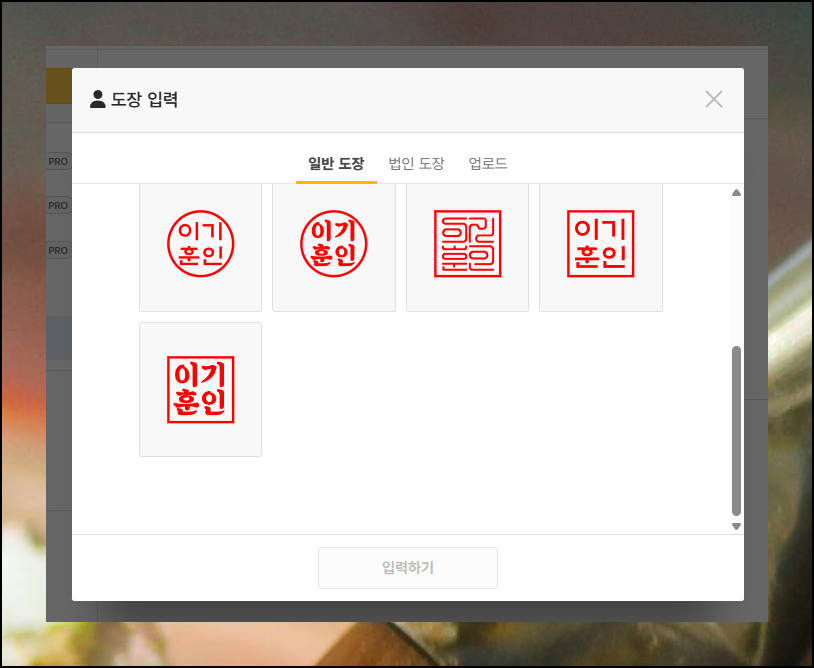제시된 다양한 디자인 옵션들 중에서 가장 마음에 드는 스타일을 골라주세요. 선택이 끝나면 입력하기 버튼을 눌러서 최종 확정하시면 됩니다. 이렇게 하면 인감 제작이 모두 완료돼요.