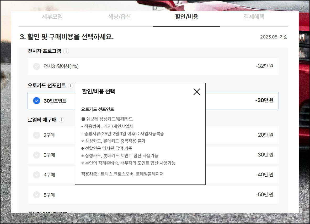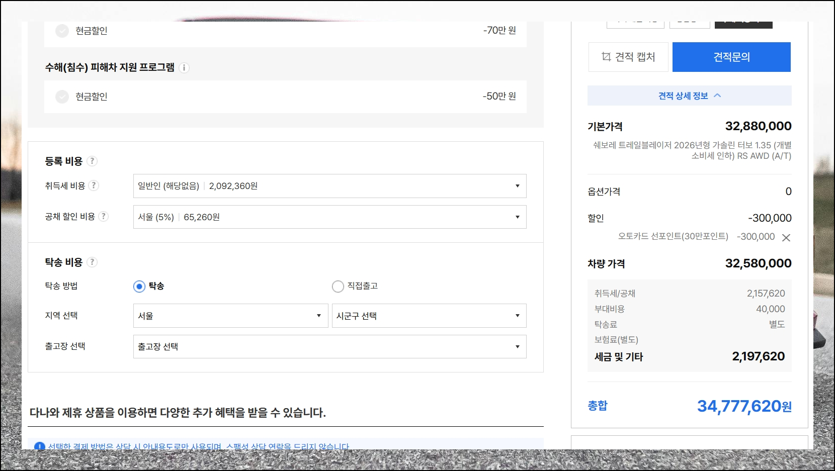 처음 차를 구매하는 분들이 놓치기 쉬운 부분이 있어요. 쉐보레자동차의 트레일블레이저 2025년형의 기본가격과 실제 지불하는 최종 합계 사이에는 큰 차이가 존재하거든요. 개인마다 고르는 옵션이 다르기 때문에 발생하는 현상입니다. 정확한 예산 계획을 위해서는 자동 계산 시스템을 활용하시길 권해요.