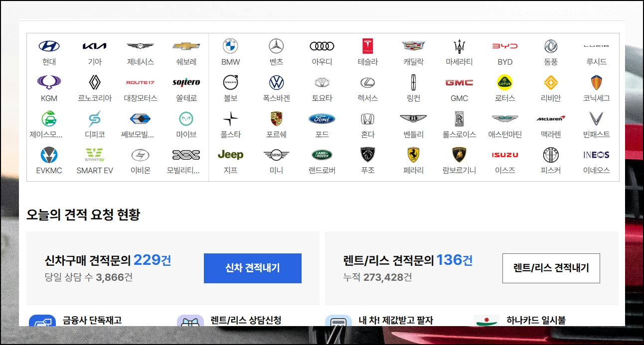 메인 화면에서 쉐보레자동차 로고를 찾아 클릭하세요. 한 곳에서 현대, 기아, 제네시스, 벤츠까지 다양한 브랜드를 비교할 수 있어요.