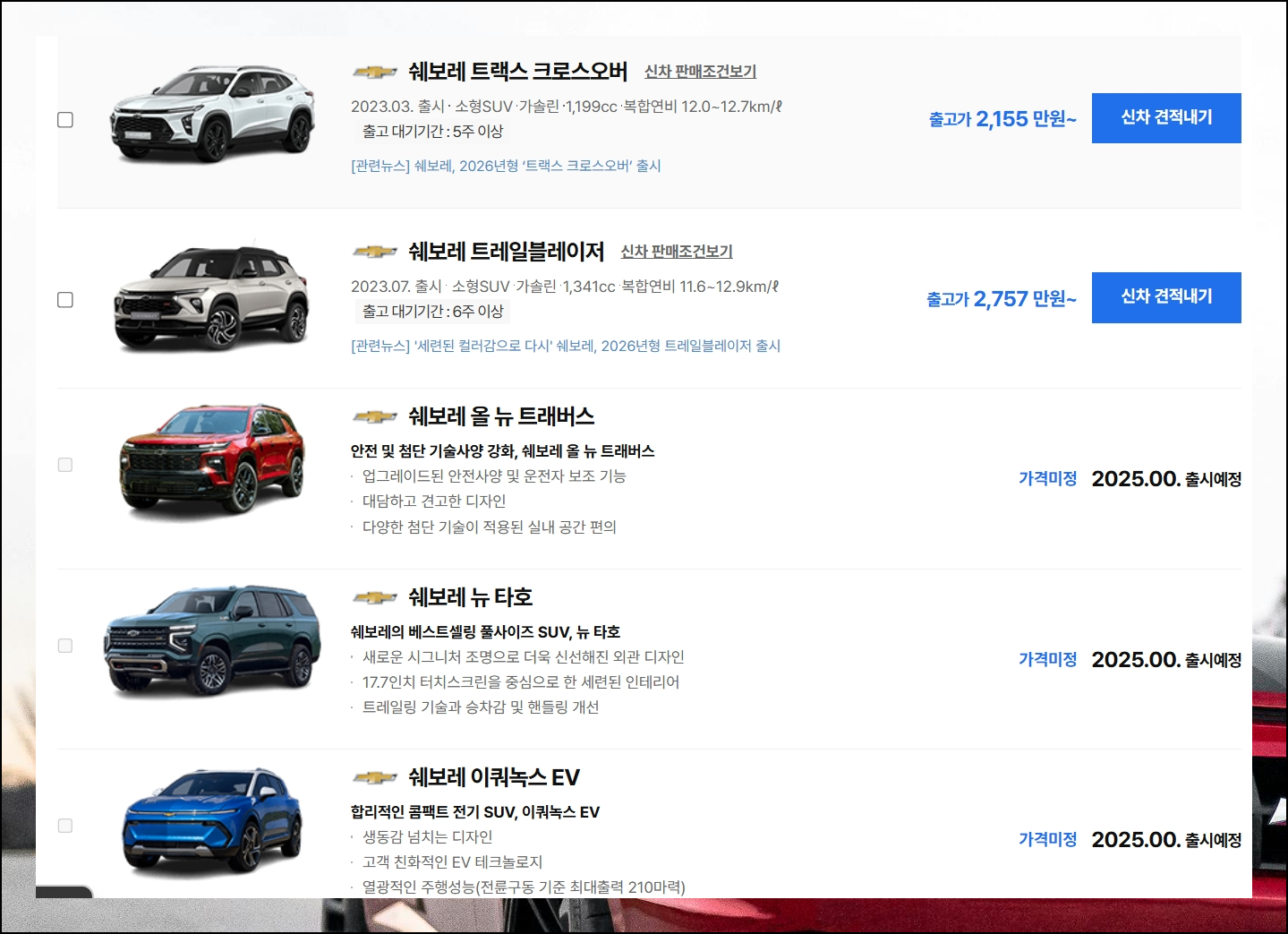 단순히 기본 모델의 출고가만 확인하는 것이 아니라, 신차가격표에서 본인이 원하는 옵션과 트림을 선택했을 때의 실제 지불 금액을 미리 계산해봐야 해요. 오늘은 온라인으로 쉐보레자동차의 정확한 구매 비용을 정확하게 확인하는 방법을 알려드리겠습니다.
