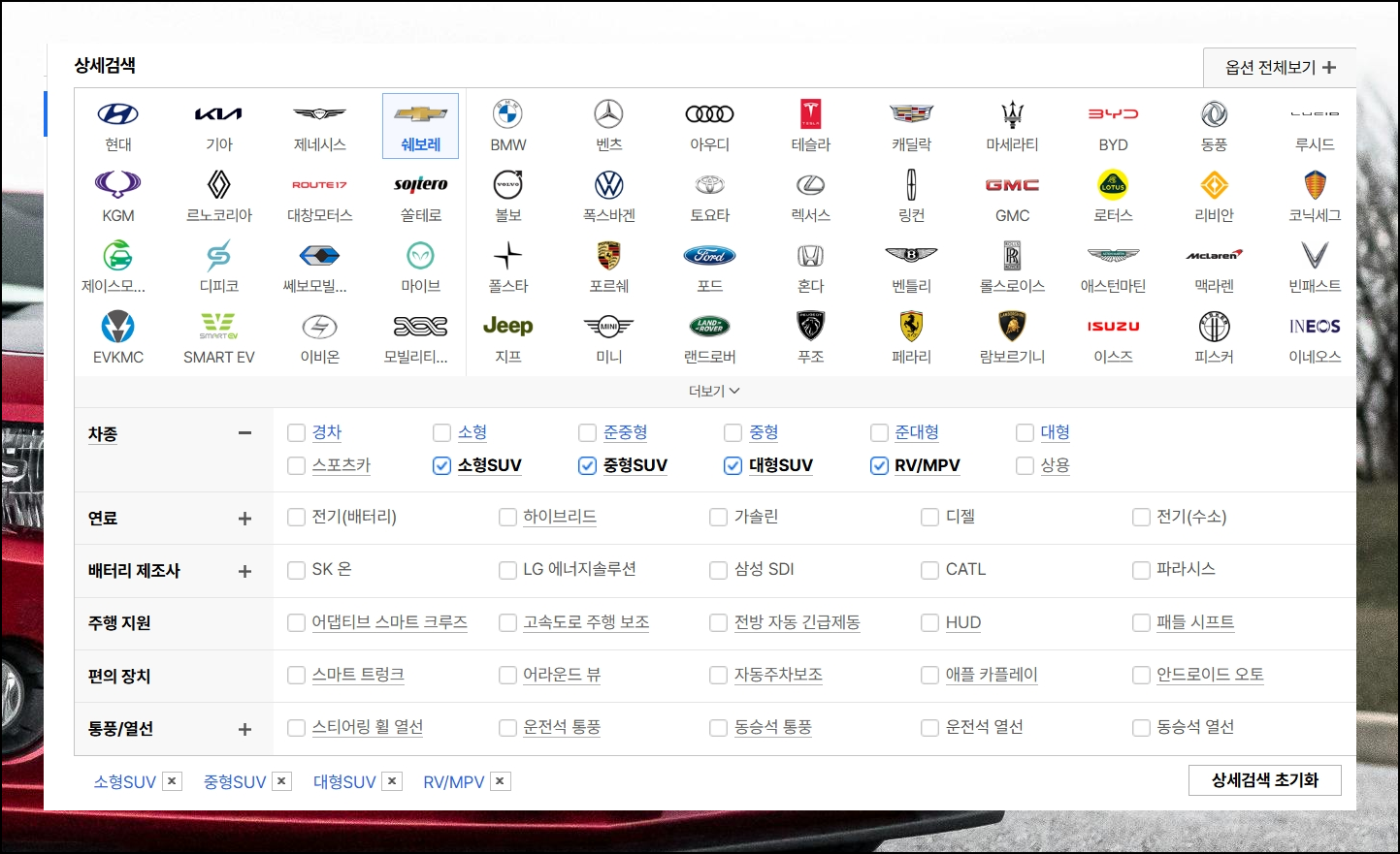 새 페이지에서 상세검색 메뉴를 활용해보세요. 원하는 차종과 연료 타입을 고를 수 있습니다. 저는 쉐보레자동차 브랜드의 suv 전체를 골랐어요.