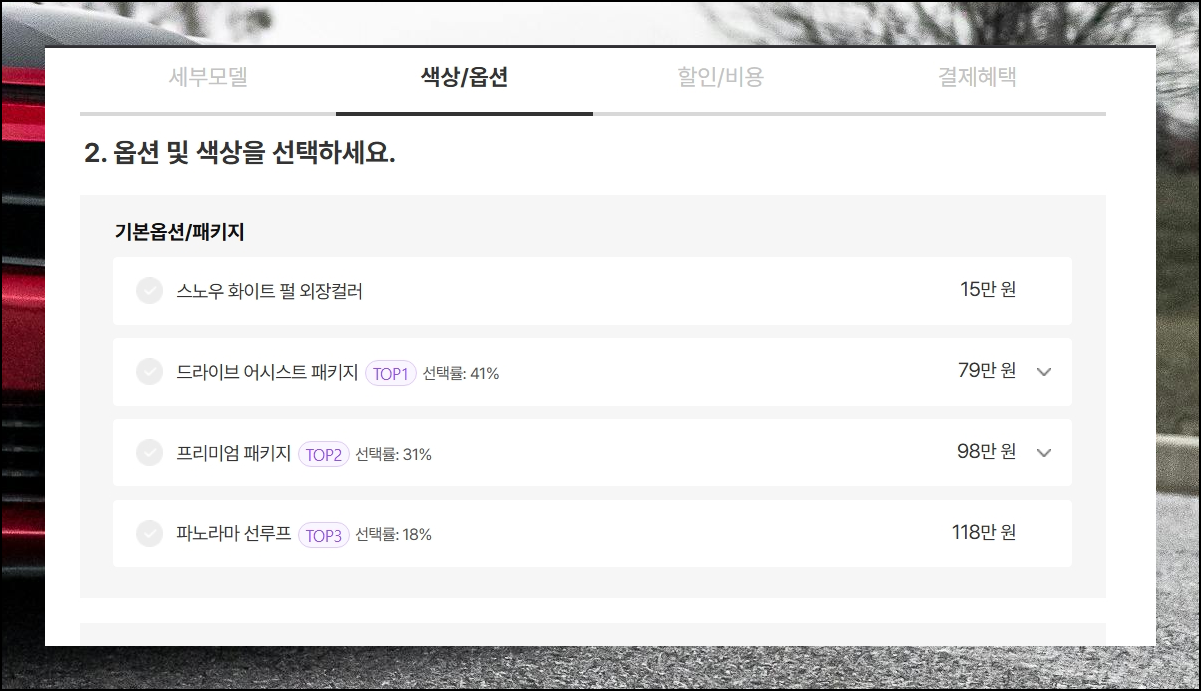 개인 취향에 맞는 옵션과 컬러를 고르는 단계예요. 추가 금액과 top 마크를 참고하시면 도움이 됩니다. 미리 정한 필수 옵션이 있다면 우선 고르고, 없다면 인기 옵션으로 구성해보세요.