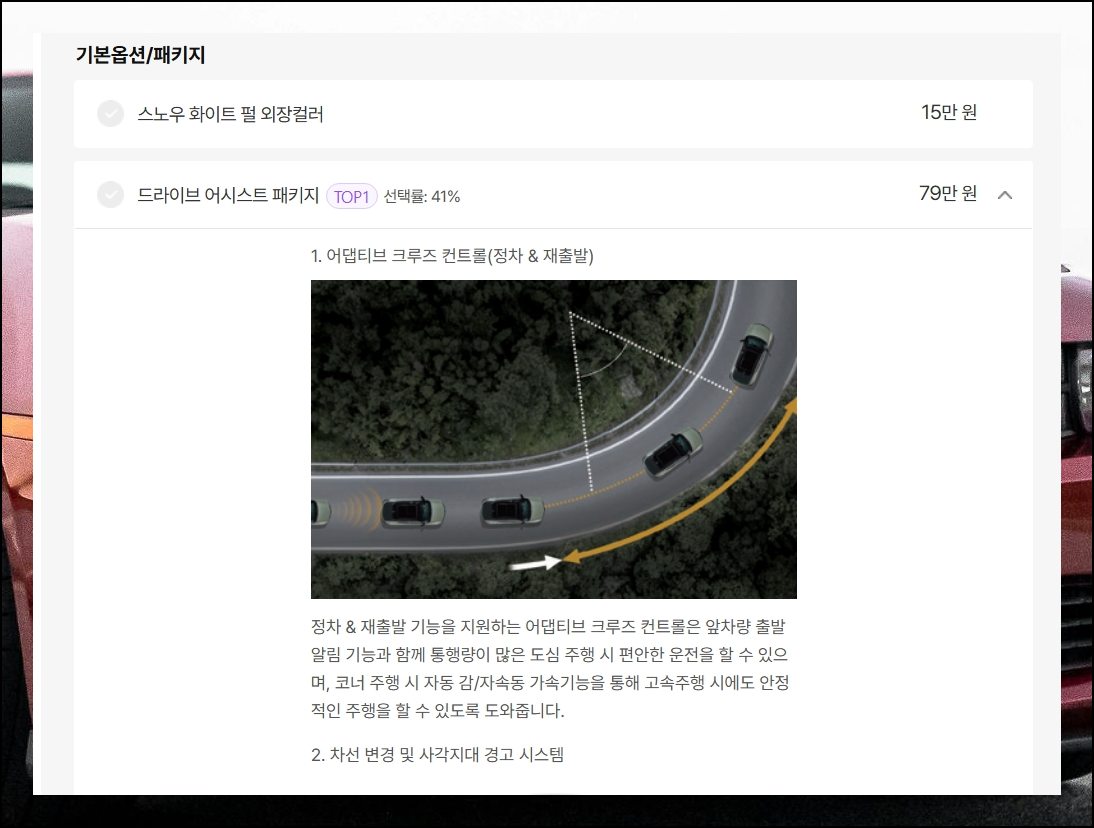 각 옵션에 대한 자세한 정보가 궁금하시죠. 옵션 가격 옆의 화살표를 클릭하면 상세 설명과 사진을 볼 수 있어요. 쉐보레자동차의 드라이브 어시스트 패키지는 어댑티브 크루즈 컨트롤 외에도 다양한 안전 기능이 포함된 인기 옵션입니다.