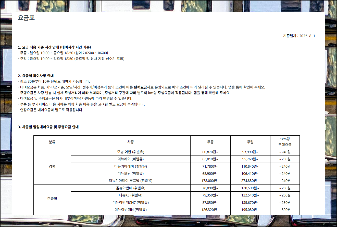 경차 기준 요금 체계를 살펴보면 원하는 기간만큼 자유롭게 선택할 수 있어 매력적이에요. 한달 동안의 예상 사용 시간을 미리 계산해보시기 바랍니다. 그런 다음 여러 옵션 중에서 가장 저렴한 것을 골라내면 됩니다. 이런 방식으로 접근하면 불필요한 지출 없이 합리적으로 활용할 수 있어요.